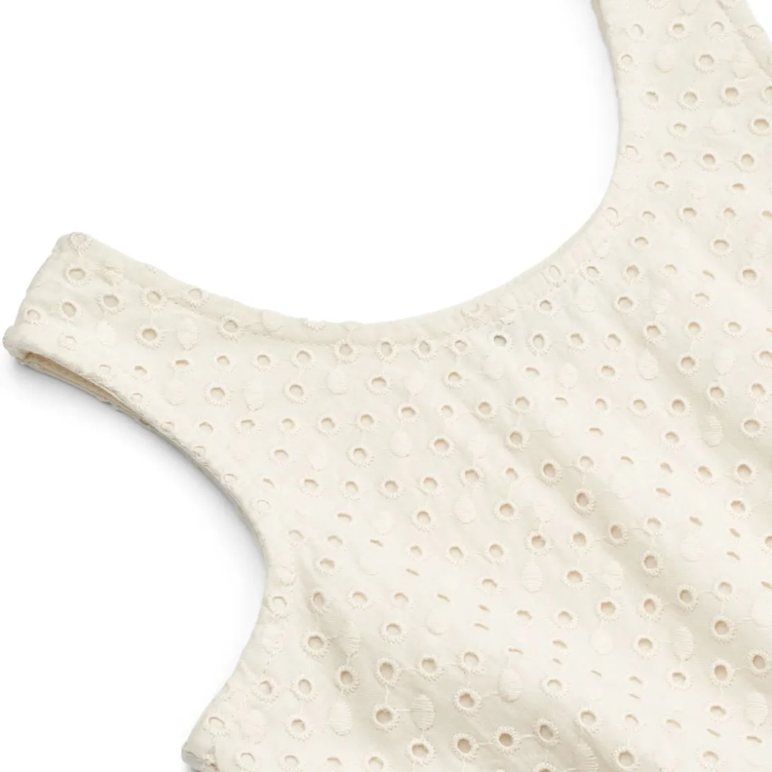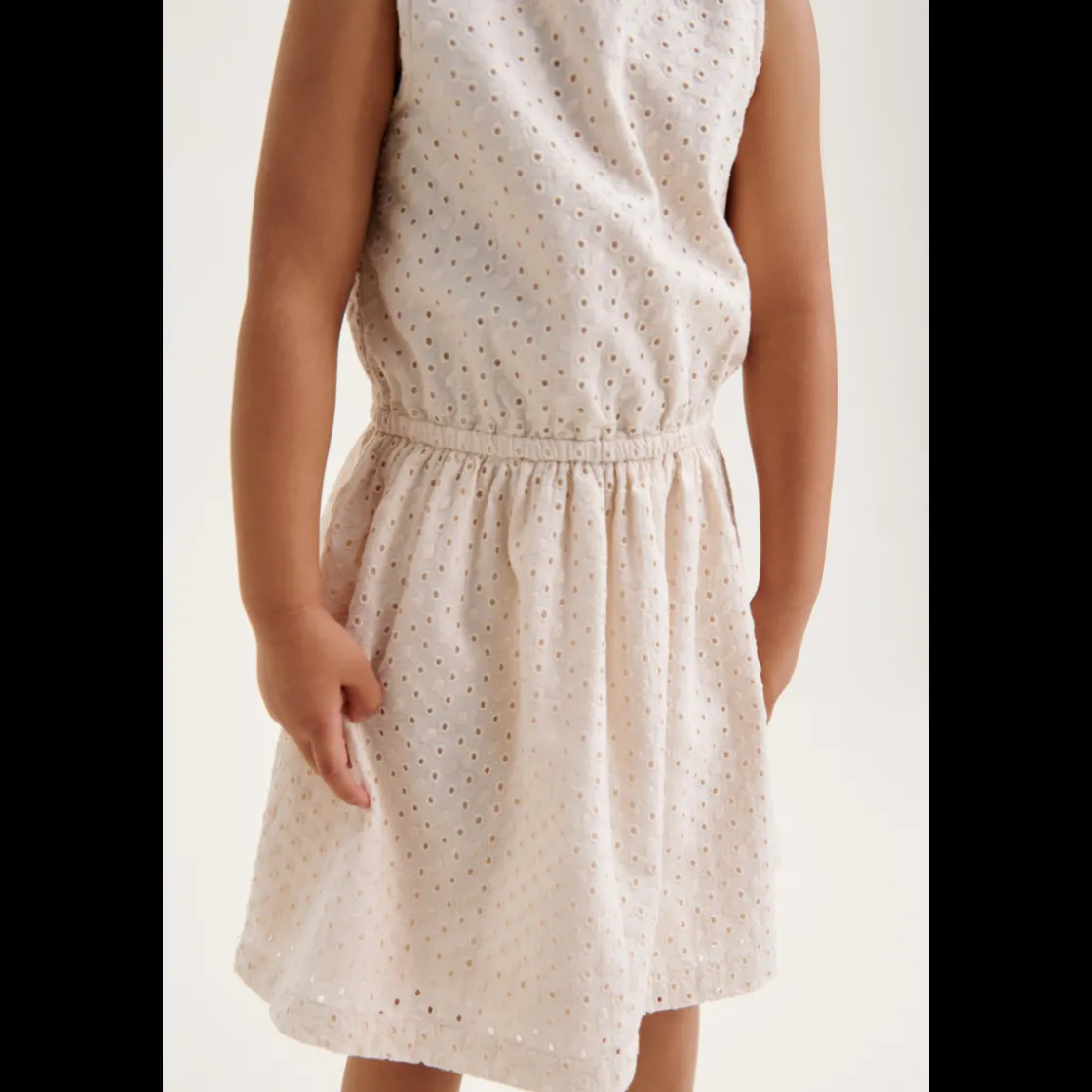 Kleid mit Lochstickerei aus Baumwolle Das romantische Idaho Kleid mit Lochstickerei aus atmungsaktiver Bio-Baumwolle ist ein echter Klassiker in jeder Frühlings- und Sommergarderobe. Mit tiefer Taille mit Gummizug und in ausgestellter Passform, damit sich das Kind gut darin bewegen kann.