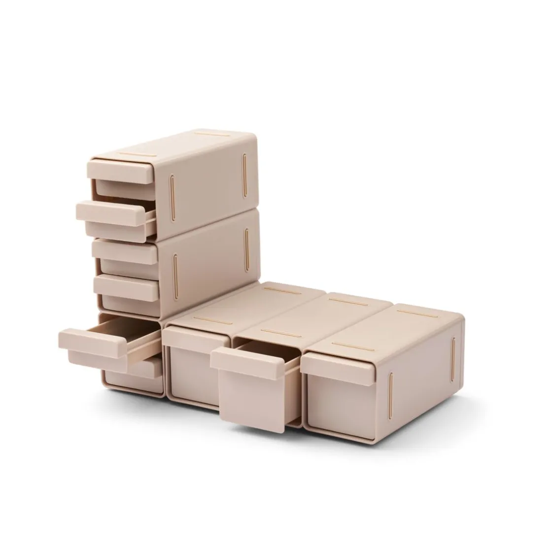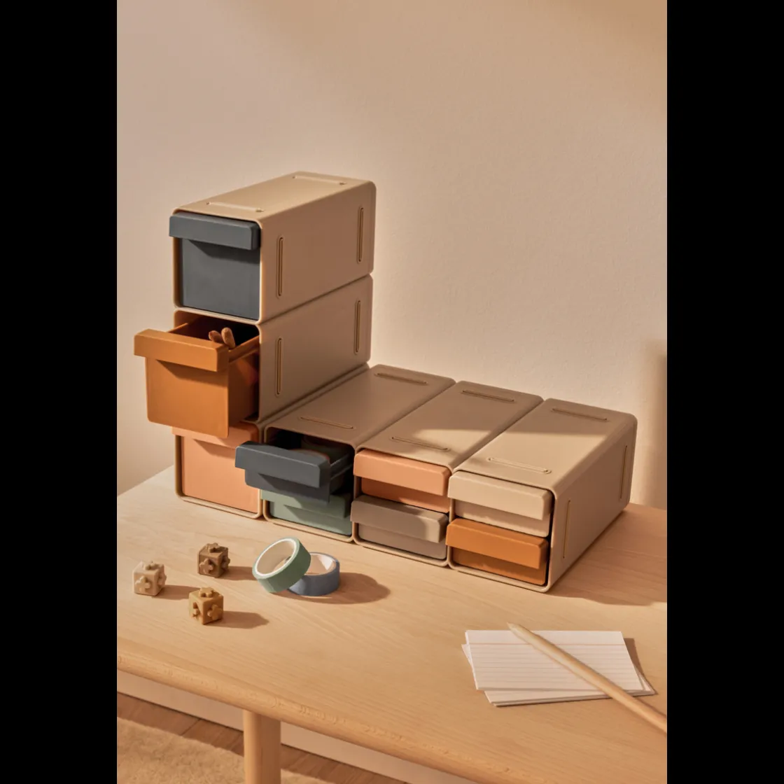 - Das System umfasst 2 Kastenrahmen, 6 kleine Schubladen, 3 große Schubladen und 4 rutschfeste Silikonfüße