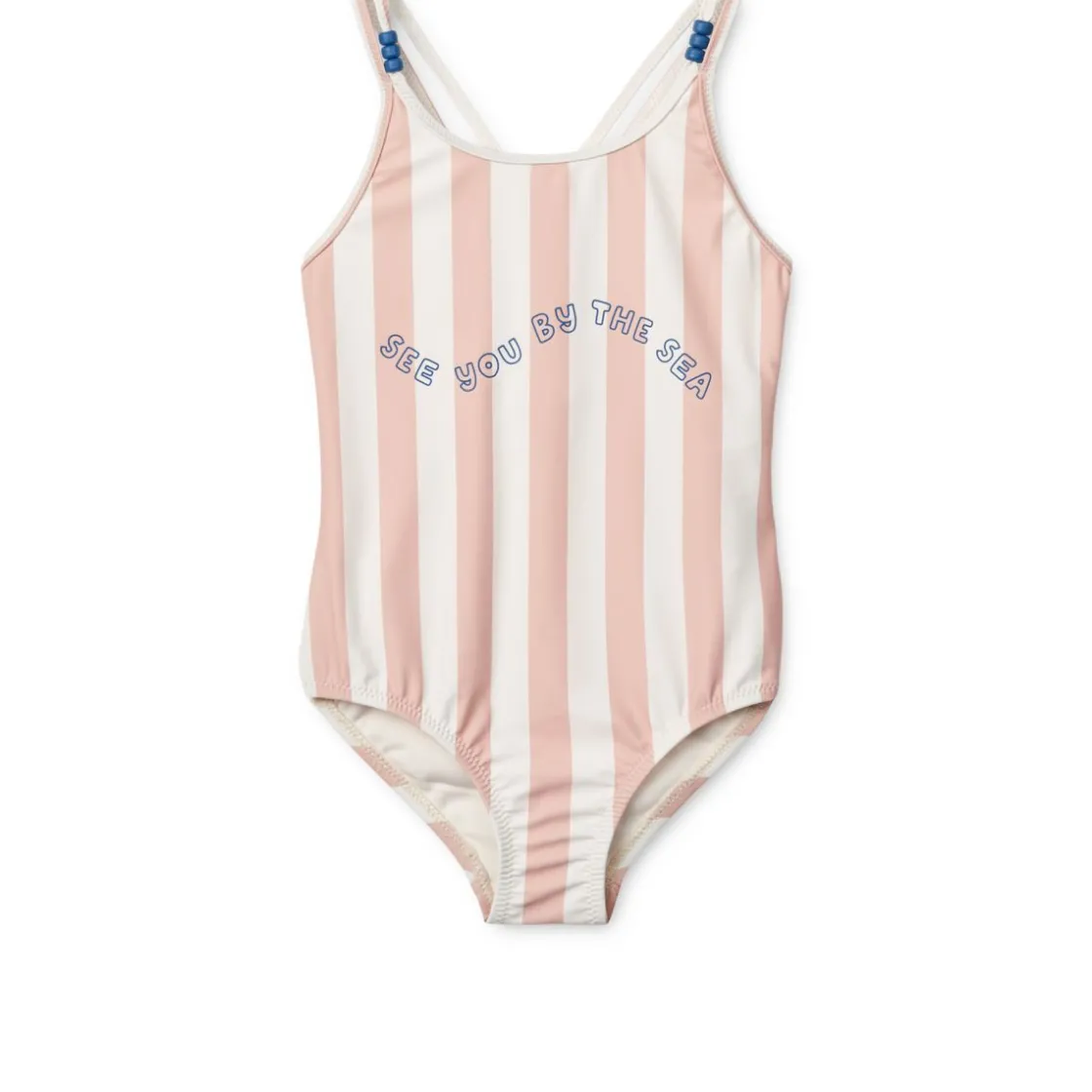- Badeanzug mit zeitlosen Streifen und bunten Perlen an den Trägern