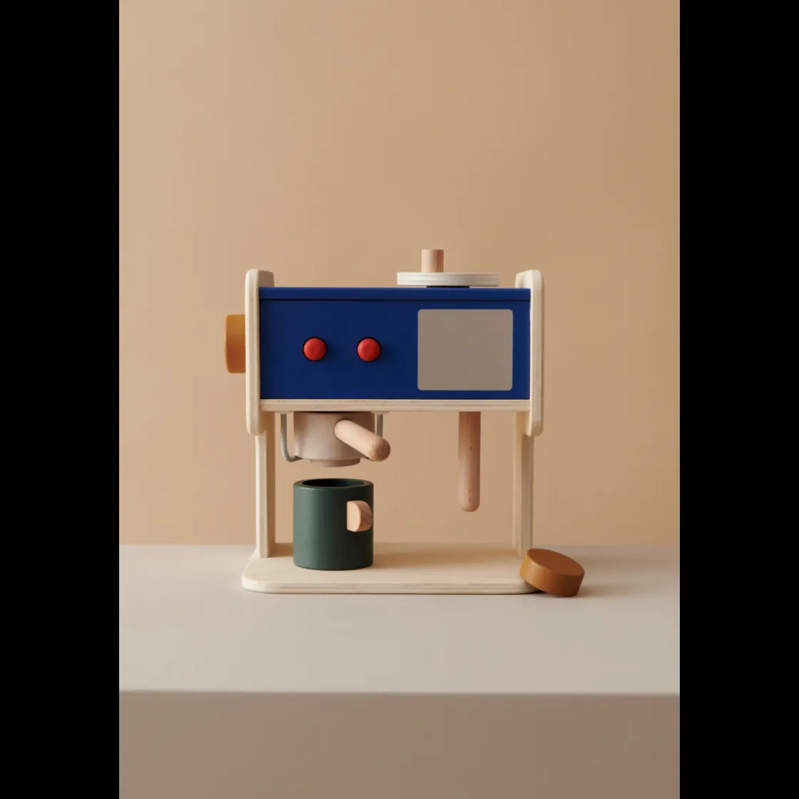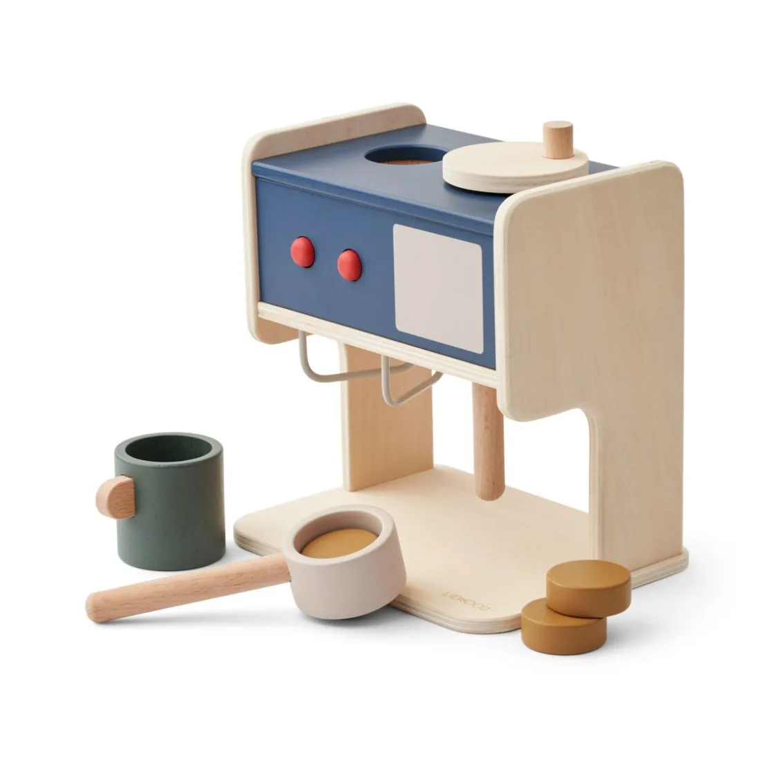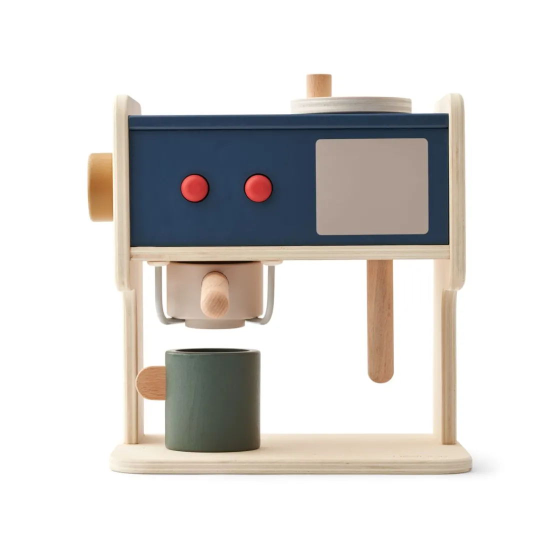 Espressomaschine aus Holz für fantasievolles Rollenspiel und interaktiven Spaß. Mit funktionalen Tasten, Kaffeegriff, Drehknöpfen und Milchaufschäumer. Enthält 3 Kaffeekapseln und 2 Tassen.