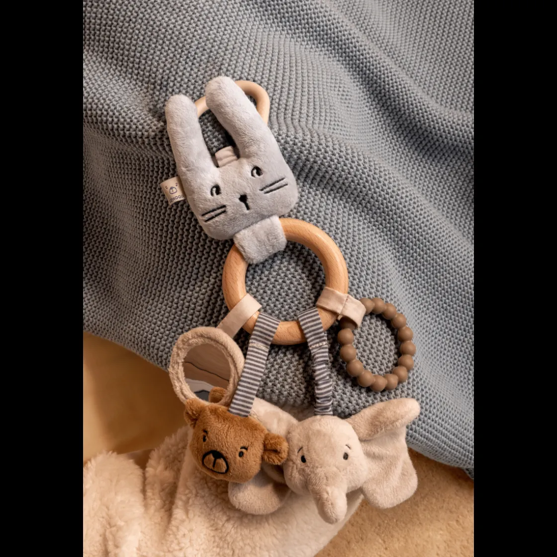 - Taktiles Aktivitätsspielzeug mit plüschigen Tierdetails und einem Beißring aus Silikon