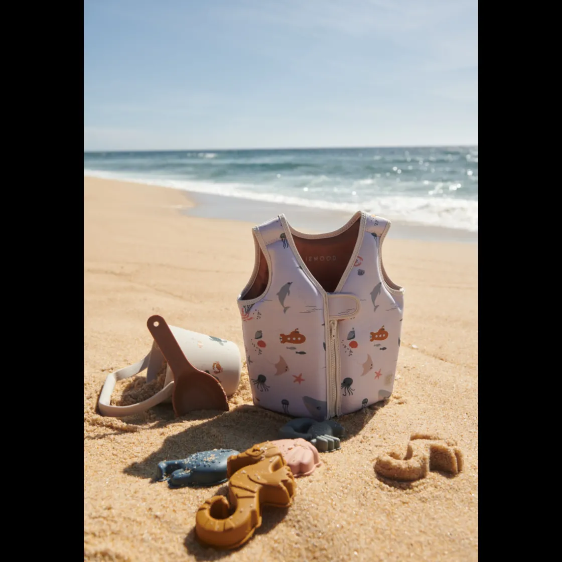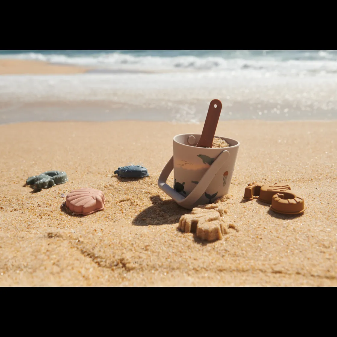 - Beinhaltet einen Eimer, eine Schaufel und vier weiche Silikon-Sandformen