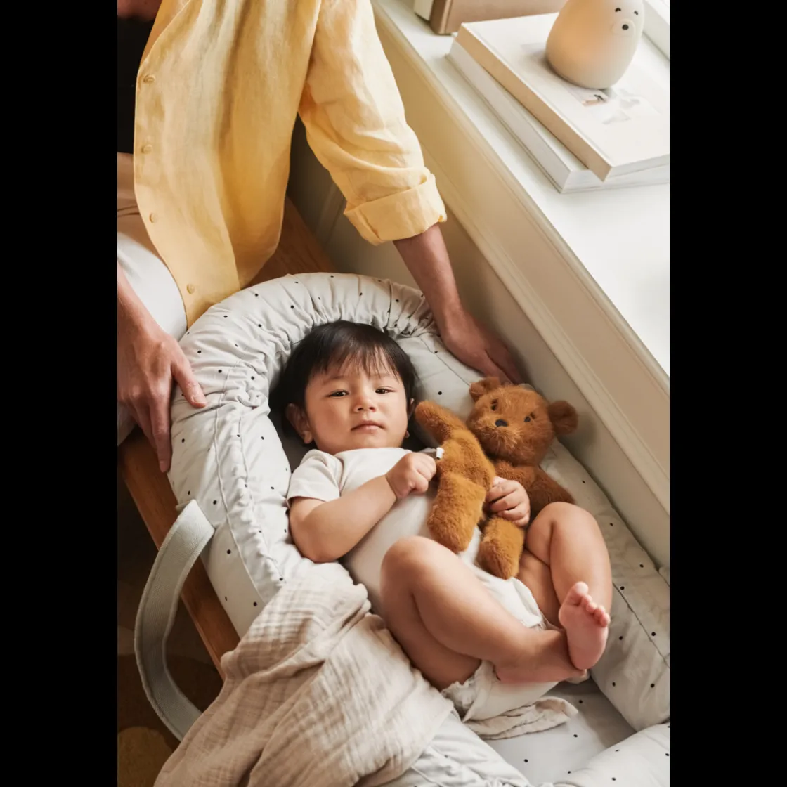 Die ultimative Verbindung von Baby-Lift und Nest mit Griffen für einfache Mobilität. Die Füllung, die Matratze und das Holzbrett sind abnehmbar, sodass der Bezug waschbar ist.