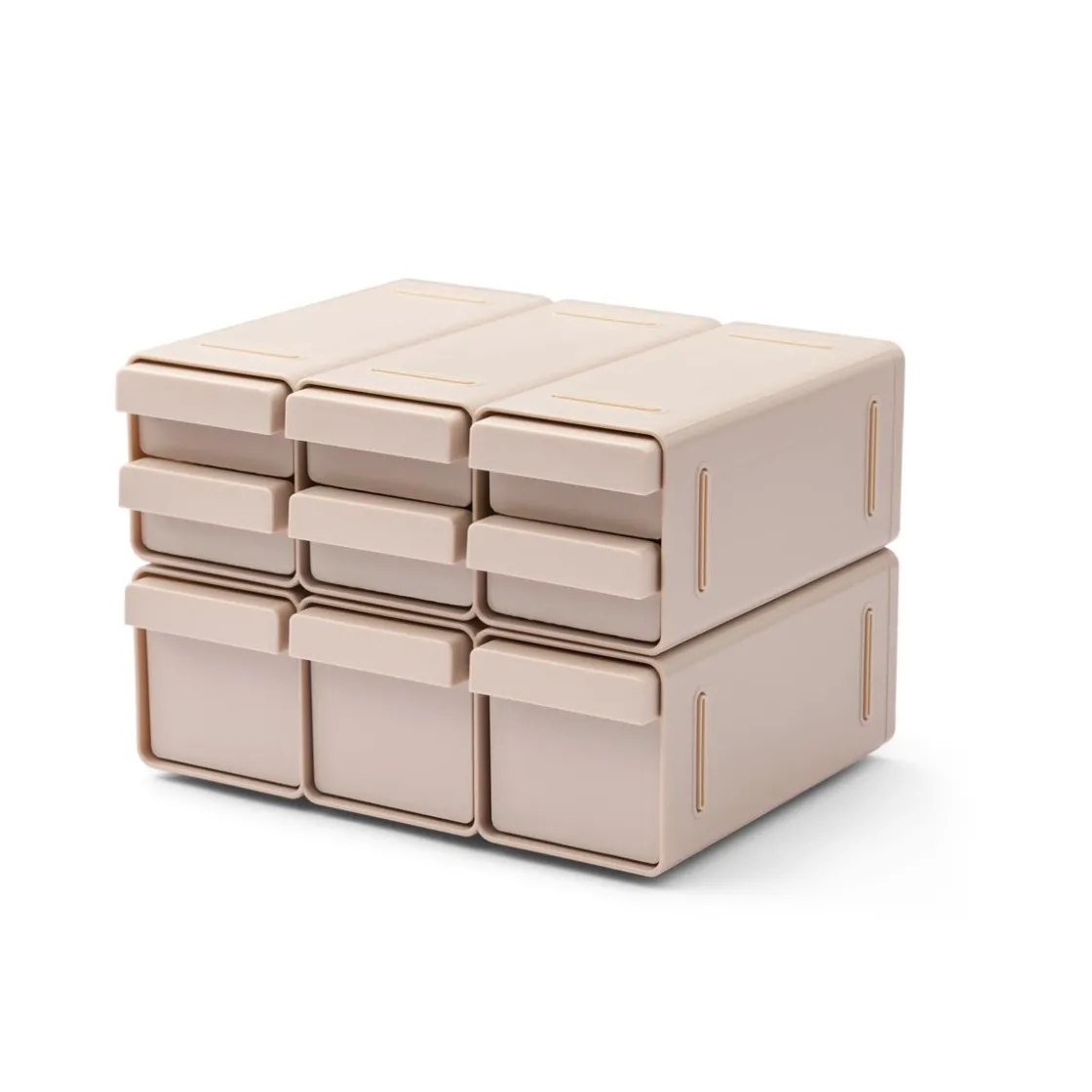 - Das System umfasst 2 Kastenrahmen, 6 kleine Schubladen, 3 große Schubladen und 4 rutschfeste Silikonfüße