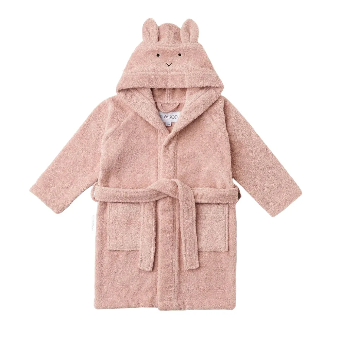 Kuscheliger Bademantel mit aufgesticktem Tiergesicht an der Kapuze und den Ohren. Der Bademantel ist praktisch und es macht Spaß ihn anzuziehen. Die dichte Frottee-Baumwollqualität hält die Kleinen trocken und kuschelig.
