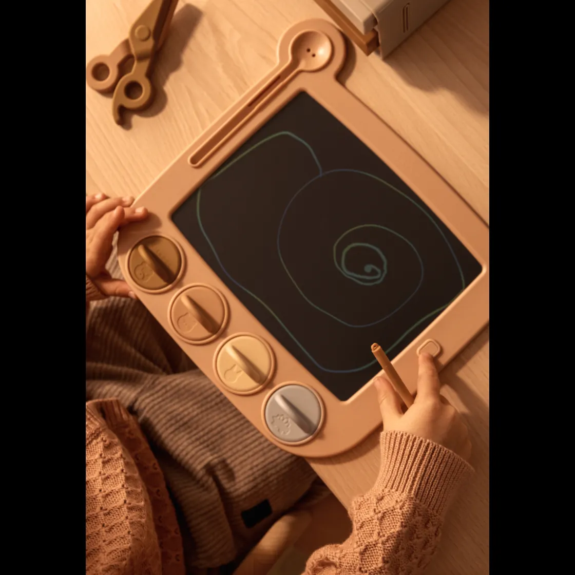 - Wenn die Zeichnung gesichert ist, kann dein Kind weiterzeichnen, aber die vordere Taste löscht das Bild nicht